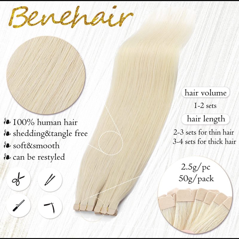 Benehair Tape in Hair Extensions Human Hair Platinum Blonde 20pcs 50g/pack Straight Hair Extensions Tape in Seamless Skin Weft Tape in Natural Hair for Women 16",#60 Platinum Blonde