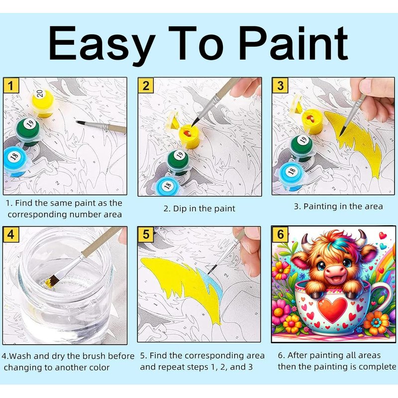 - đ¨ăCanvas and AcrylicăAnimals paint by number kids have High-quality canvas,the surface of the canvas is smooth and clean, the numbers are easy to identify, and the outline of the lines is clear.environmentally friendly acrylic paint, full bright color, easy to color, fast drying, strong coverage.