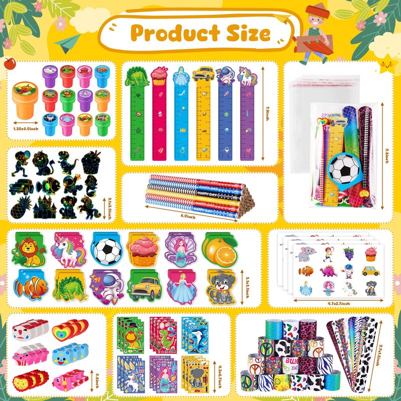 - Suitable Size: mini notebook about 3 x 3 inch, pencils about 7.5 inch, ruler about 1.2 x 7.9 inch, make-a-face stickers about 6.7 x 4.3 inch, slap bracelets about 8.7 x 1.2 inch, stampers about 1.38 inch, stickers about 4.7 x 2.7 inch, color scratch about 5.1 inch, erasers about 0.5 inch, party favors set fit in most sea themed classroom party goodie bags.