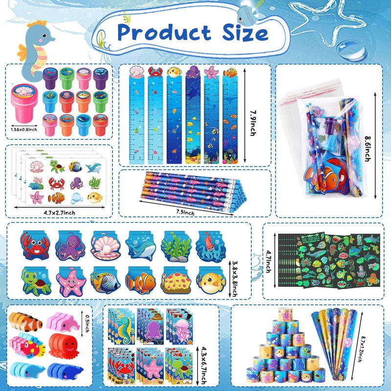 - Suitable Size: Under the Sea mini notebook about 3 x 3 inch, pencils about 7.5 inch, ruler about 1.2 x 7.9 inch, make-a-face stickers about 6.7 x 4.3 inch, slap bracelets about 8.7 x 1.2 inch, stampers about 1.38 inch, stickers about 4.7 x 2.7 inch, tattoos about 4.7 x 2.7 inch, erasers about 0.5 inch, Under the Sea party favors set fit in most sea themed classroom party goodie bags.