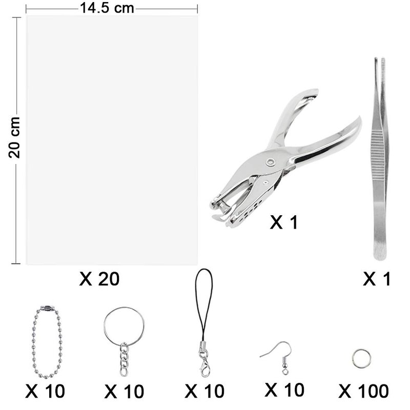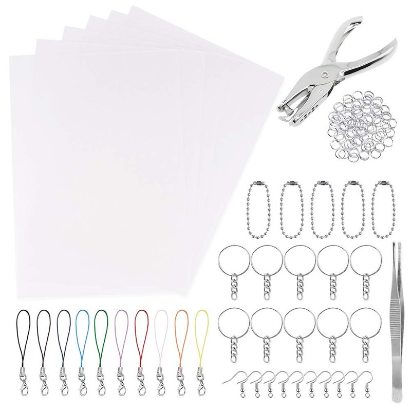 Benvo 157 Pcs Heat Shrink Plastic Sheet Kit Shrinky Art Film Paper 20 Pcs with 135 Pcs Keychains Accessory Ear Hooks Chain Beads Lobster Clasps and Hole Punch, Tweezer for Creative DIY Handmade Craft