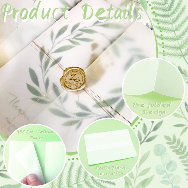 - HIGH-QUALITY VELLUM- Made of high-quality 93gsm vellum paper with a smooth surface and a solid feel. Will easily add an elegant and luxurious touch to your invitation cards and also provide a protection for them. The vellum jackets look beautiful with or without wax seals or ribbons