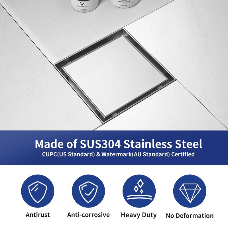 - 【One Grate, Two Choices】Our floor drain designed with a 2-in-1 flat tiles grate. With this grate, you can choose a brushed stainless steel look, or cover with your own bathroom tile, which results in a completely invisible shower drain.