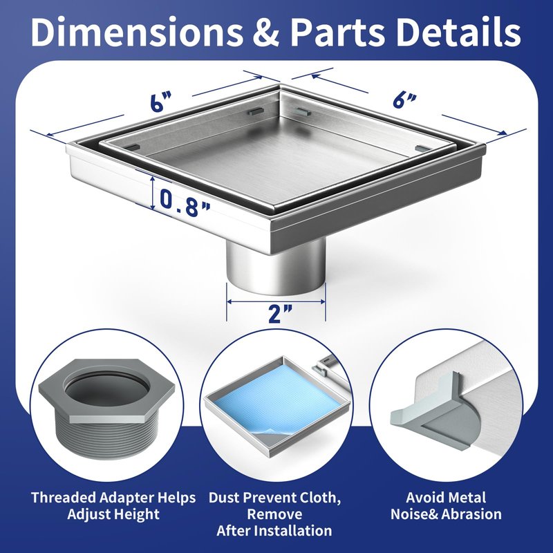 - 【What’s In The Package】A shower drain comes with a dust prevent cloth, you can remove it once installation finished. 4 tile tray supporters are for lifting the grate to avoid metal noise & abrasion. With a lifting hook can remove the hair strainer easily. Threaded adapter with O-ring rubber can help adjust height. An instruction is also included.