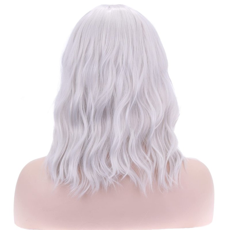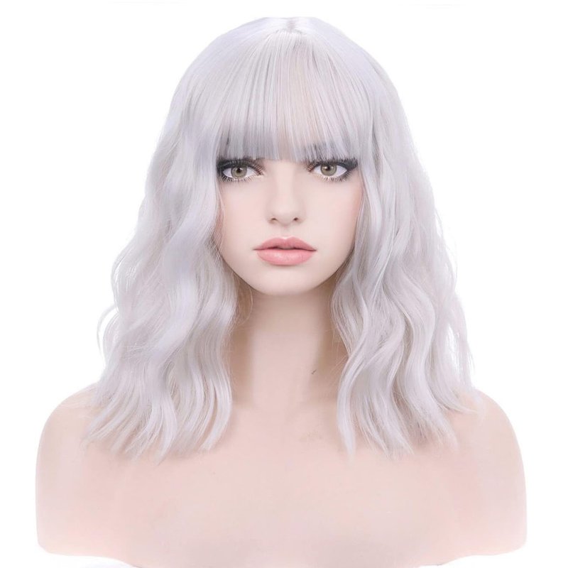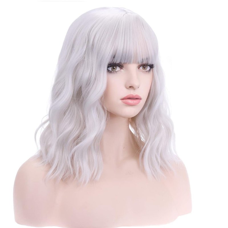 BERON 14 Inches Silver Wig Short Curly Wig Women Girl's Synthetic Wig Silver White Wig with Bangs Wig Cap Included