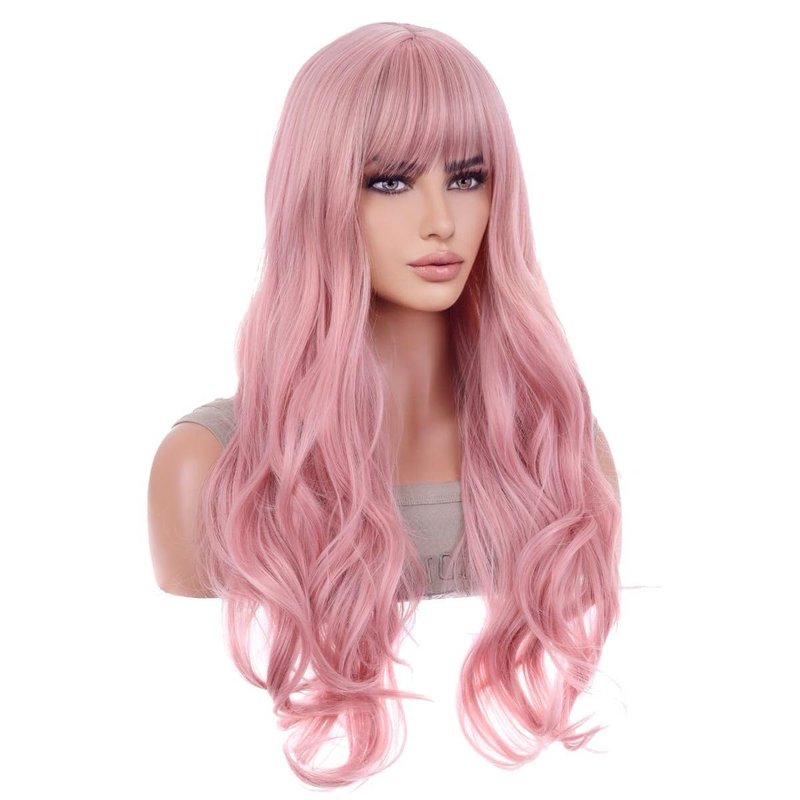 BERON 26 Inches Pink Wig Long Wavy Wig with Bangs Synthetic Wig Long Wig Pink Wigs for Daily Party with Wig Cap