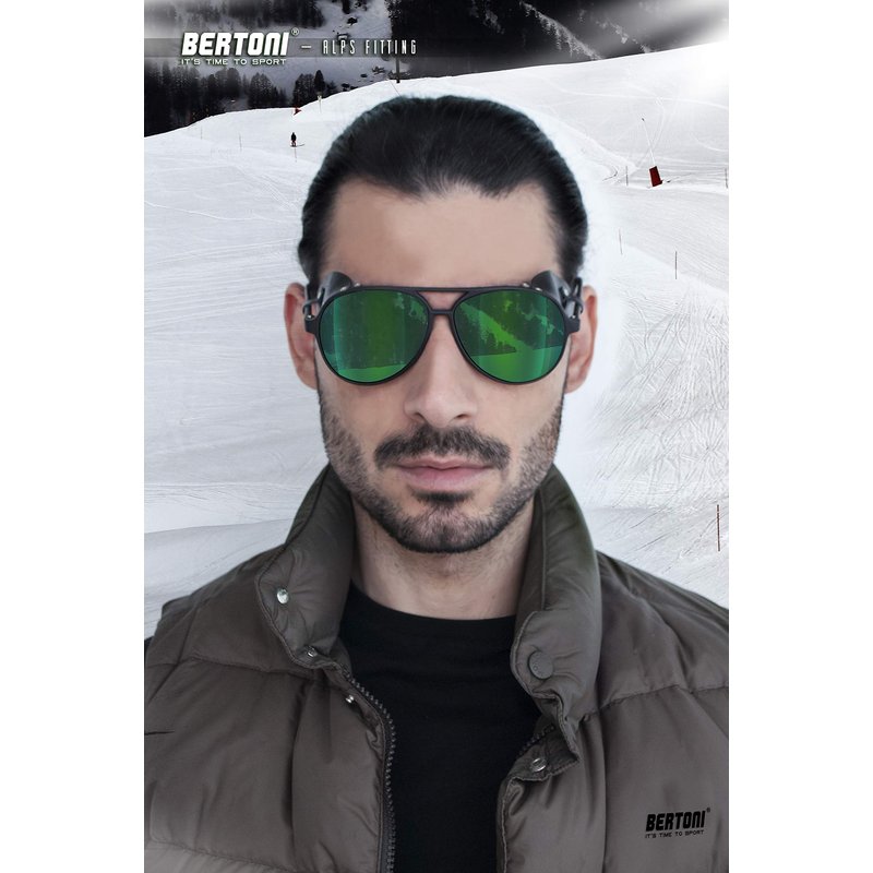Bertoni Glacier Polarized Sunglasses for Mountain Hiking Trekking Ski mod ALPS Italy (Black - Polarized Green Mirror)