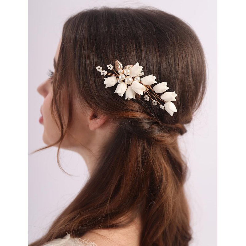 - Materials:Crafted with gold-toned metal and pearls,this comb offers a luxurious and long-lasting finish. Size:the flowers pearls hair side comb is 4.3 inch in length,2.4 inch in width.