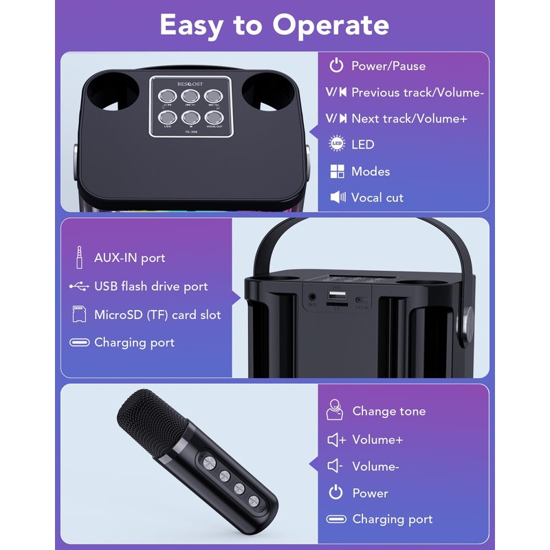 Step into the spotlight with our sleek, portable mini karaokee machine, designed to amplify your entertainment game! Boasting two wireless microphones and a sound quality that's simply out of this world, it's the perfect companion for game nights, music marathons, and cinematic extravaganzas. The advanced audio driver and DSP technology ensure every note is crisp and distortion-free, making every performance a hit. Get ready to add a splash of fun to your child's vocal journey with our 7 engaging voice effects—karaoke, original, echo, male, female, kid, and magic sound. Toggle through these effects with a simple press and hold of the microphone's eff button for 3 seconds, creating a variety of singing adventures. Keep the party going with our long-lasting 1500mAh rechargeable battery, which keeps the tunes rolling for up to 3-5 hours. This isn't just a karaoke machine; it's a portable Bluetooth speaker that's perfect for any gathering, ensuring the good times never stop. Looking for the perfect gift for a little star? Our BESCOST karaoke machine is a fantastic pick for kids aged 3-12+. It's not just a toy; it's a tool for fostering creativity and a lifelong passion for music. Its compact design makes it the ultimate singing buddy for any kid dreaming of making it big. Ease into the karaoke action with our user-friendly machine. Equipped with the latest Bluetooth 5.0 chip, it supports TF card, flash USB, and aux-in connections. Its tiny footprint means you can set up a karaoke bar in any room, any time, effortlessly capturing the thrill of a professional karaoke experience.