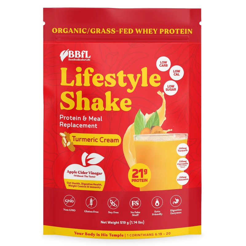 Best Bodies for Life - Meal Replacement Powder with A Shot of Apple Cider Vinegar - 15g Organic Grass Fed Whey Protein Lifestyle Shake - 15 Servings, Turmeric Curcumin Cream