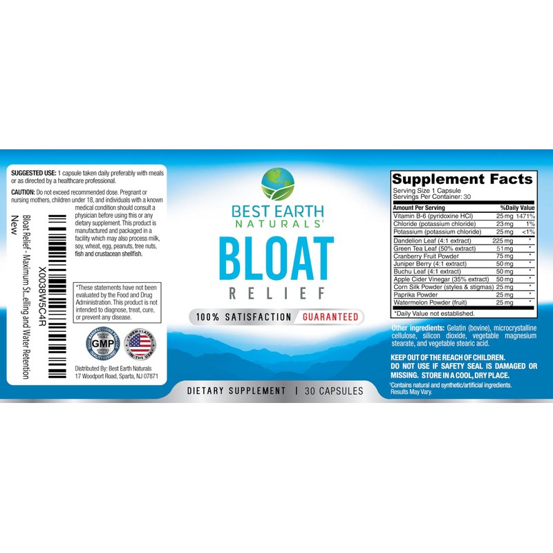 - Best Earth Naturals Bloat Relief is made in the USA with globally sourced ingredients and manufactured in a GMP (Good Manufacturing Practices) facility with the highest-quality nutrients.