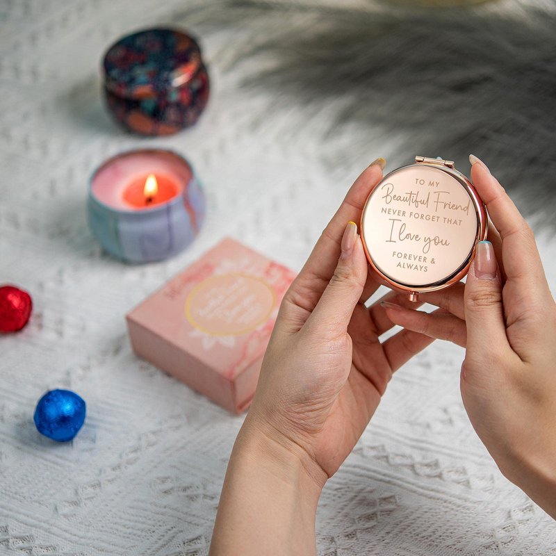 - đź’• FRIEND KEEPSAKE GIFT WILL LAST FOREVER: Made of sturdy Stainless Steel, our compact mirror resists daily wear, rust, fading, scratches, and deformations for years. The sentimental message is laser engraved and will remain always clear.