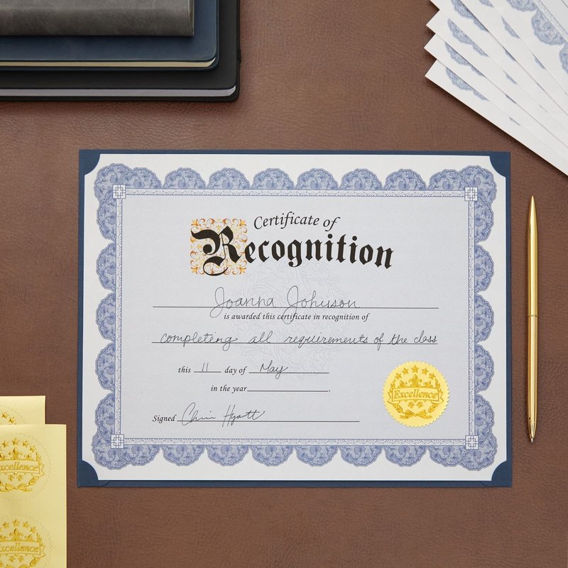 - Letter Size Sheets: In this pack, you'll receive 48 custom recognition certificates, each measuring 8.5 x 11 inches, adorned with an elegant blue border design. Additionally, included are 48 exquisite gold foil seal stickers, each bearing the word "Excellence," adding a touch of prestige to your certificates