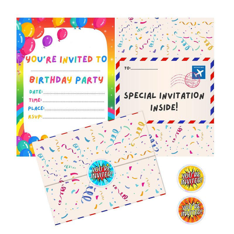 - INCLUDES HOLOGRAPHIC STICKERS: This pack of invites includes 36 super cool "YOU'RE INVITED" holographic stickers which are used to seal your invitations shut once you've written them out. The pack includes 3 different colours, blue, orange and yellow. You're guests will be super excited when they receive on of these invites.