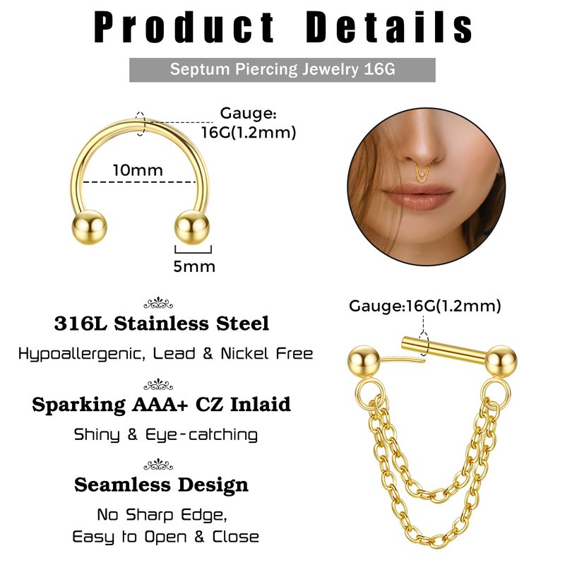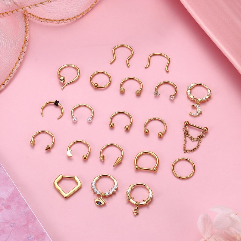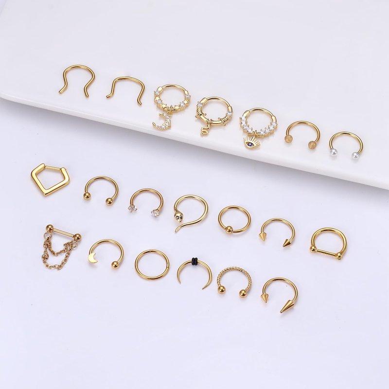 - ๐๐ซ๐๐๐๐ ๐ท๐๐๐๐๐๐๐ ๐ฑ๐๐๐๐๐๐๐Our septum rings 16g includes 20pcs septum clickers in different styles, including horseshoe septum rings, dangle nose rings hoop, daith piercing jewelry and so on. Available in 3 colors: Steel, Gold-tone & Black. Our surgical steel septum ring 16g pack offers a variety of styles to meet your different matching needs. โโCute & Easy to Put In