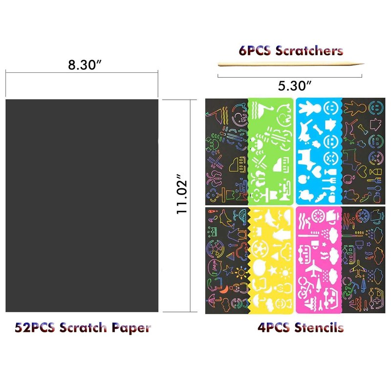 - 【52 Sheets Rainbow Scratch Paper Kit】This set includes 52 sheets of rainbow scratch paper, each measuring 8.3 x 11.02 inches, along with 6 bamboo styluses and 4 drawing stencils. These versatile tools provide endless creative opportunities for both kids and adults. The vibrant rainbow backgrounds inspire artistic expression and are ideal for various art projects.