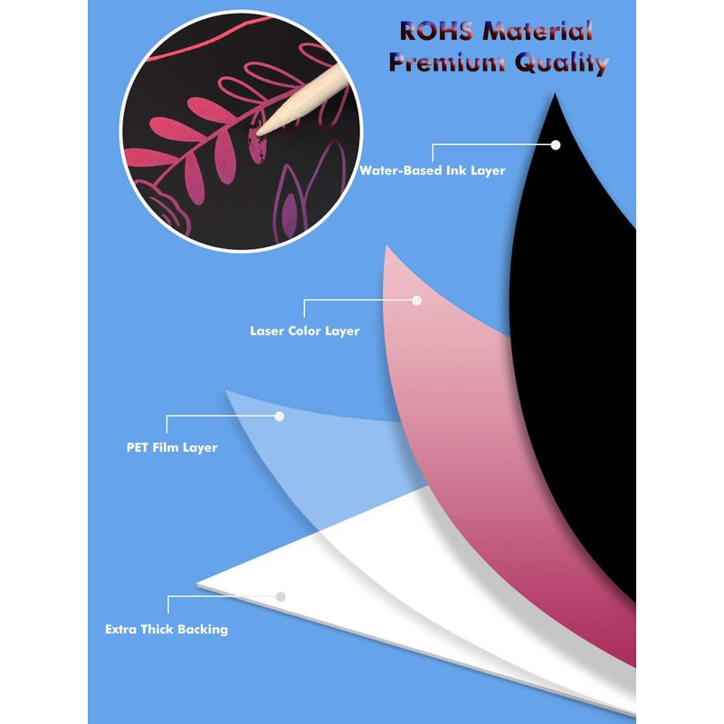 - 【Easy to Use & Endless Creativity】Simply use the included bamboo styluses to scratch away the black coating and reveal the beautiful rainbow backgrounds. This easy-to-use process requires no paint and is suitable for creators of all ages. Whether for kids’ crafts or adult doodles, this set provides endless fun and creative inspiration.