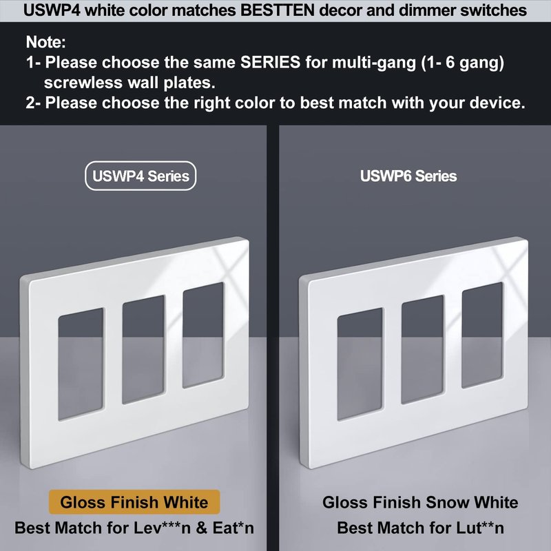 - USWP4 series for white color and USWP6 series for snow white color. To match your outlets/switches, please select the right series, color, finish, and gang