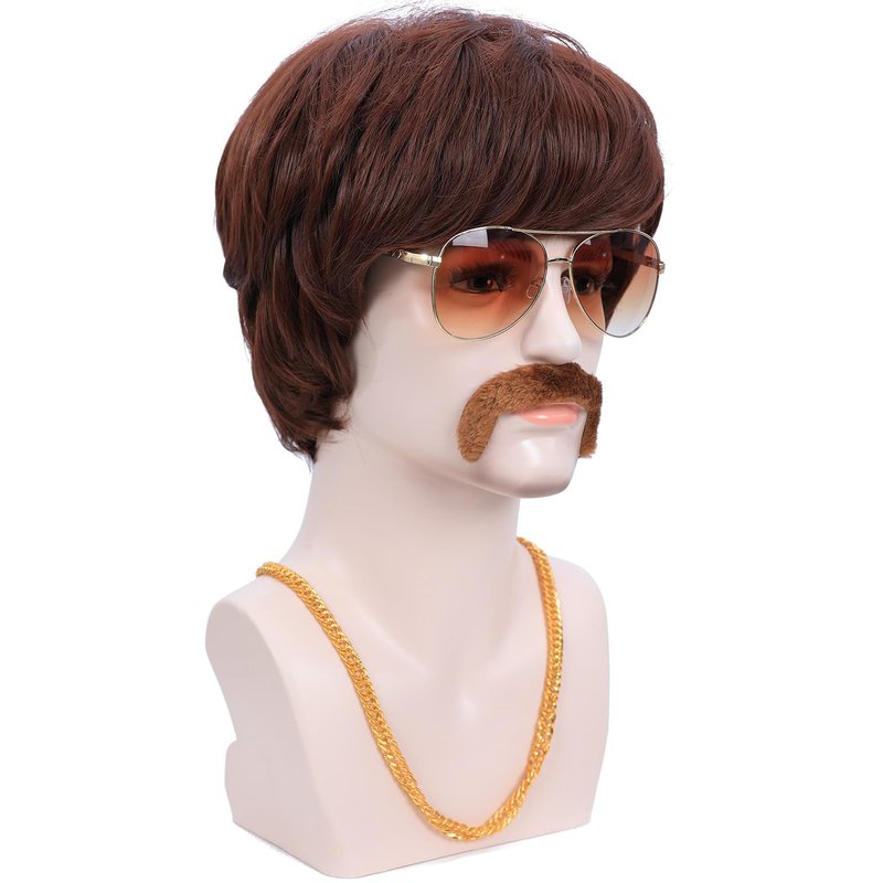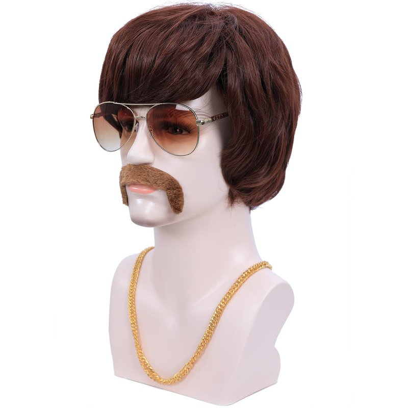 - Package Includes: 1pc 70s Mens Wig + 1pc Brown Mustache + 1 pair of Retro Glasses + 1pc Golden Chain + 1pc Wig Cap