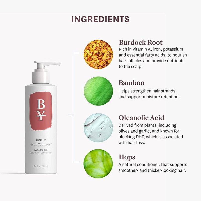 - INGREDIENTS: Wake Up Call Volumizing Shampoo: Burdock Root, Bamboo, Sage and Hops. Wake Up Call Volumizing Conditioner: Burdock Root, Oleanolic Acid, Bamboo, and Hops. Hair Redemption Restorative Butter Masque: Vitamins and amino acids in Mango, Macadamia Seed, Cupuaçu, Murumuru and Avocado Butters.