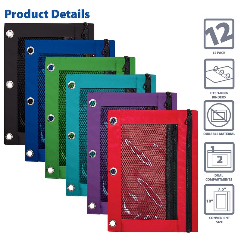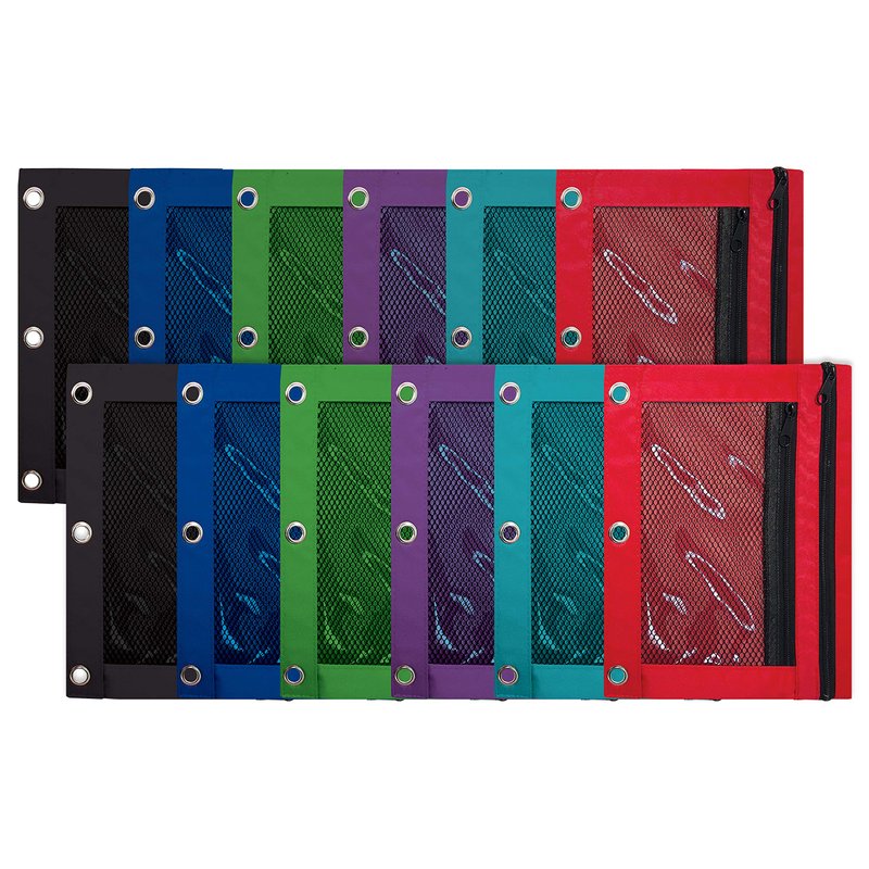 Better Office Products 3 Ring Pencil Pouch, 12 Pack, with Mesh Window, 2 Compartments, Assorted Colors