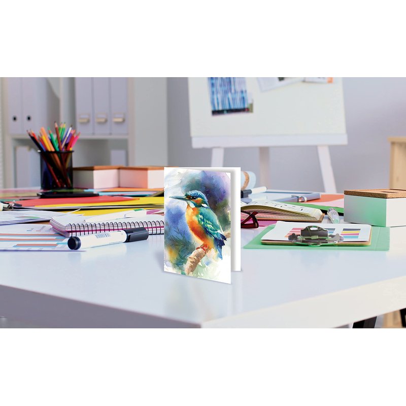 Bulk all-occasion greeting card box set including 50 cards featuring 6 printed watercolor paintings of a butterfly and a variety of beautiful birds; complete with 50 white envelopes. Cards are made of 90 lb. cover stock for a high-quality look and feel.