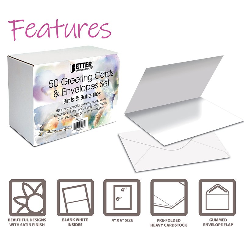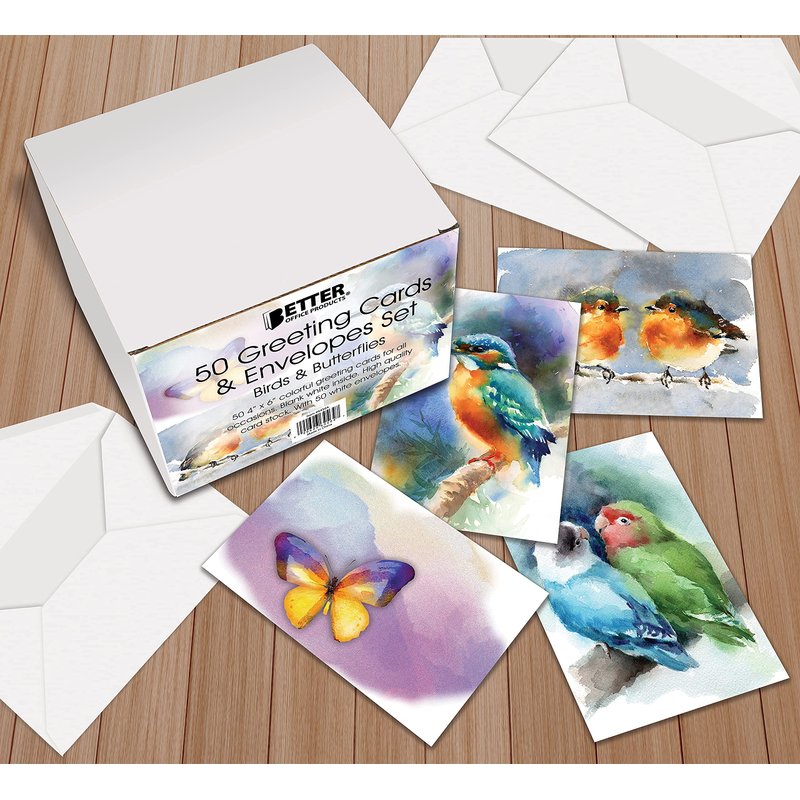 Better Office Products 50-Pack All Occasion Greeting Cards Box Set, 4 x 6 inch, 50 Assorted Blank Note Cards & 50 Envelopes, 6 Butterfly & Birds Designs, Blank Inside, 50 Pack