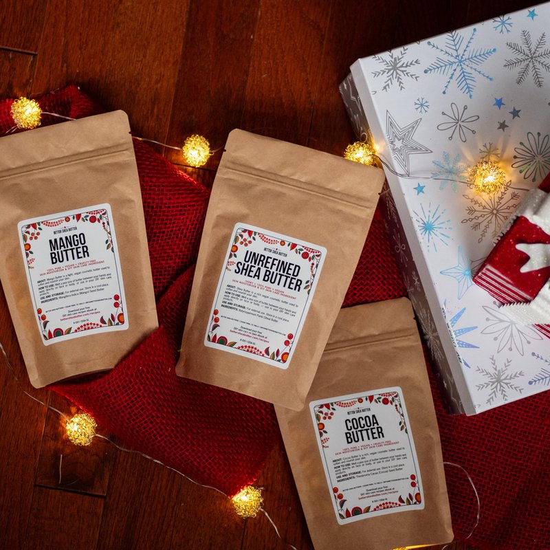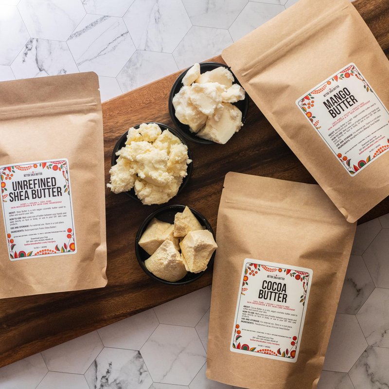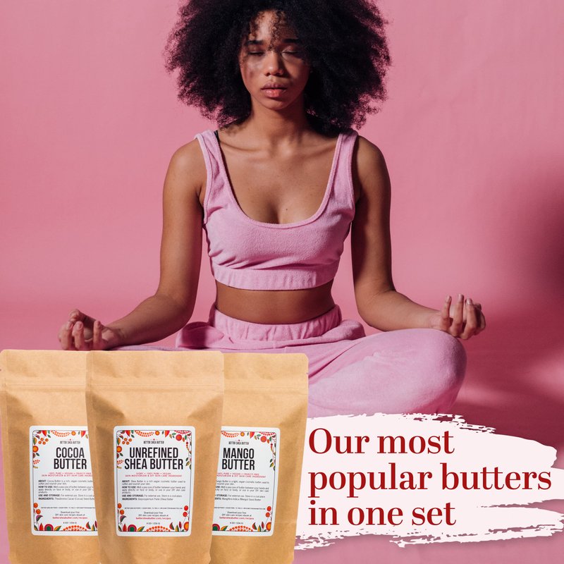 This fantastic set features 8 oz of each of our three top skin care butters: Unrefined Shea Butter, Cocoa Butter and Mango Butter. All of these butters can be used as stand-alone moisturizers or ingredients in DIY whipped body butters and other skincare recipes. 8 oz Shea Butter 8 oz Mango Butter 8 oz Cocoa Butter