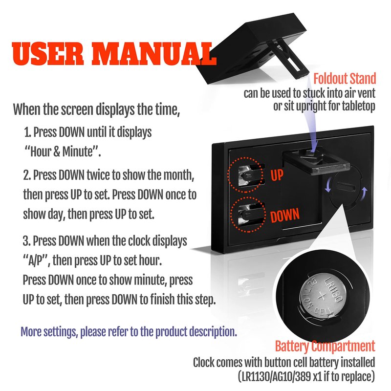 - Compact and portable: it features a mounting bracket where you can slide the clock in and take it out on camping. Powered by 1pc lr1130 cell battery included.