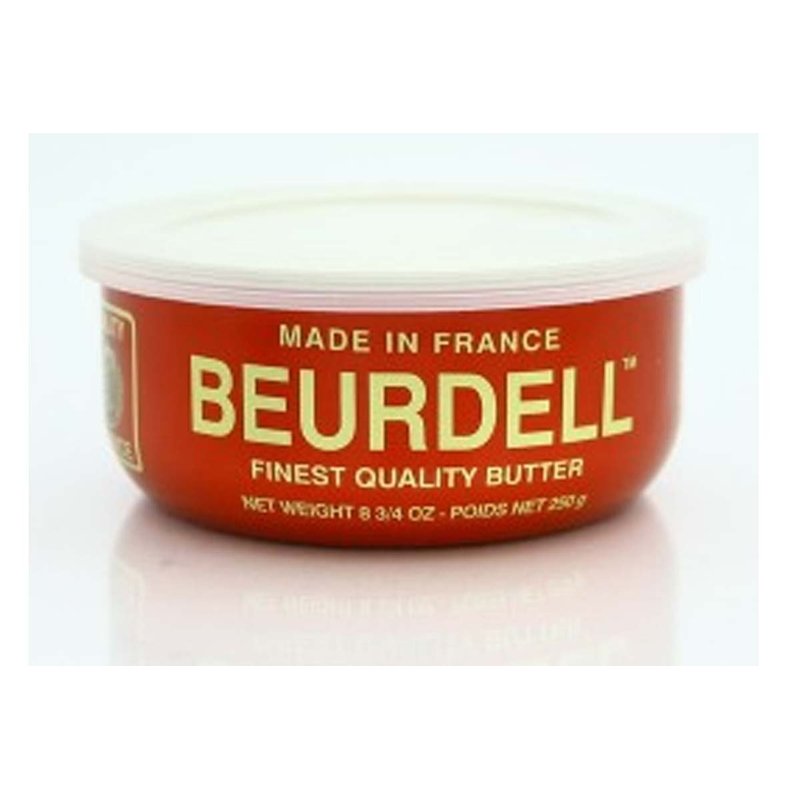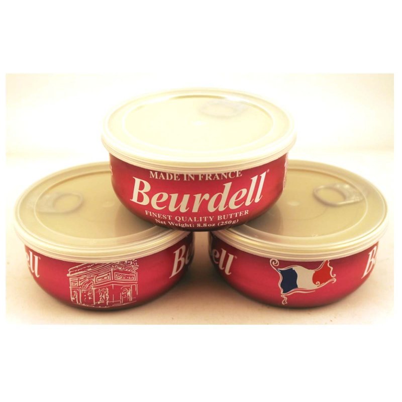 Beurdell Pasteurized French Salted Butter in 8.8oz (250g) tin. Beurdell Pasteurized Butter preserved through the addition of extra salt, has an unctuous texture and a rich, cheeselike taste. Perfect for baking. Try a taste of the old world with this sumptuous French butter, made in the traditional way. Their methods allow the development of the prized nutty characteristics the region is famous for. This time-honored tradition creates very pure butter with an incomparable taste and texture. The finest French butter is 100% all natural. Product of French.
