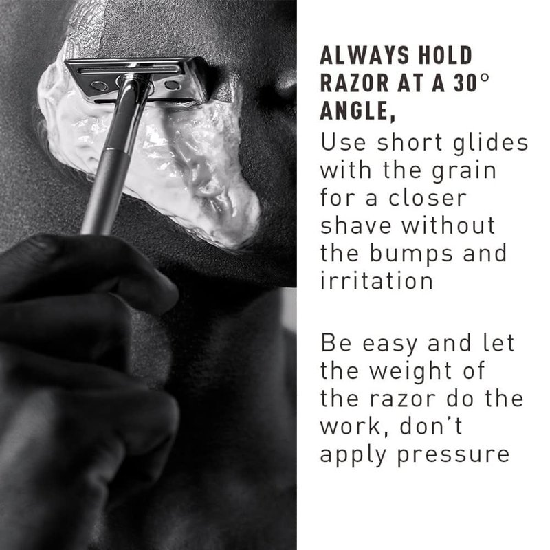 - FOR BEST USE: Always hold the Safety Razor at about a 30° angle. Holding the logo on the head against your skin, tilt the handle until the blade just touches your skin. Be easy and let the weight of the razor do the work, don’t apply pressure. Keep your glides short and don’t forget to always shave in the direction your hair is growing.