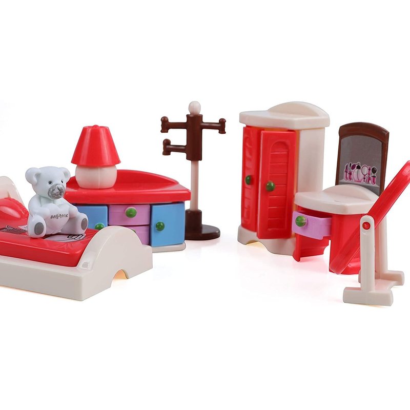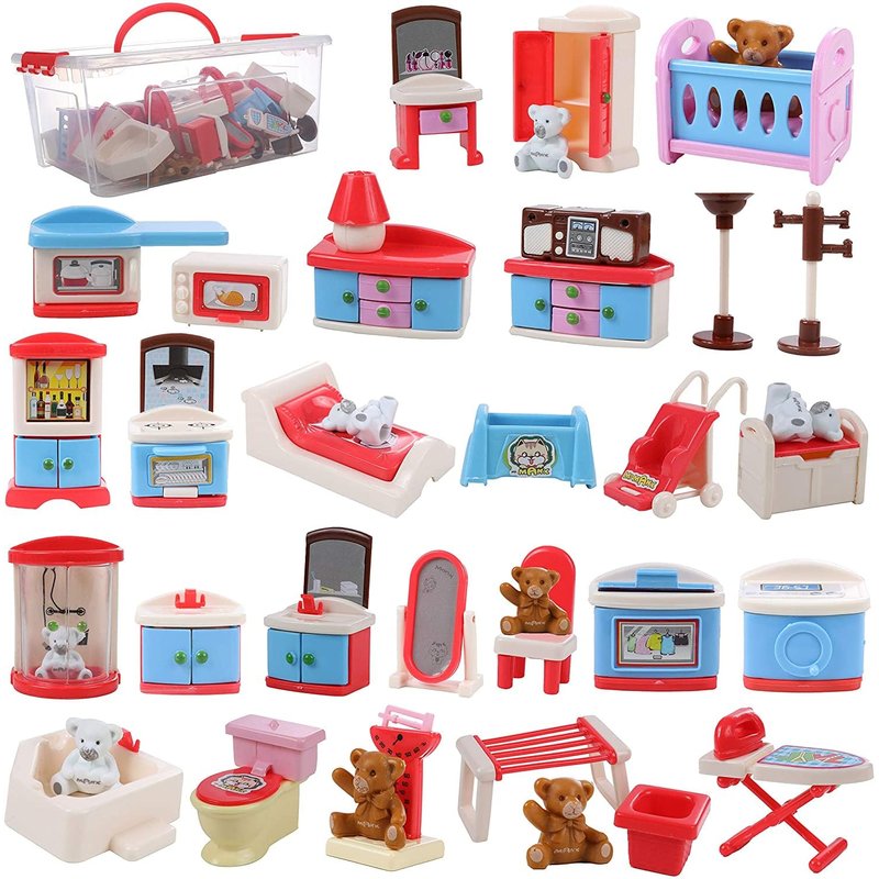 - 45 Pieces of Doll House Furniture And Accessories: 5 sets of dollhouse furniture which are perfect for 5 dollhouse rooms, Bedroom, Nursery bedroom, Kitchen, Laundry room, and a Bathroom with extra dollhouse accessories and a storage box