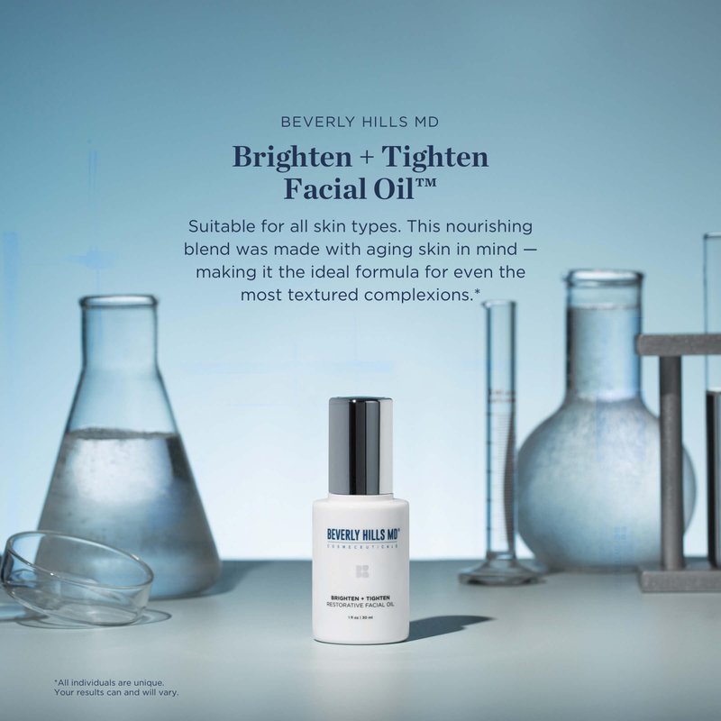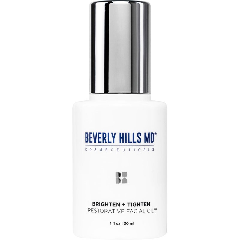 Beverly Hills MD Brighten + Tighten Restorative Facial Oil is expertly formulated to reduce the look of sagging skin, dark spots, and dullness. This fast-absorbing, non-greasy lipid solution uses advanced skin-firming technology to help provide a visible ‘tightening’ effect — plus, deep-penetrating antioxidants to help reactivate your youthful radiance.*