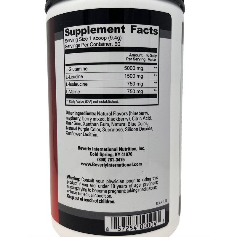 Beverly’s L-Glutamine contains 100% pure, pharmaceutical grade L-Glutamine and nothing else. GLUTAMINE SELECT is a powdered drink mix consisting of the amino acids glutamine, leucine, isoleucine and valine. The latter three comprise the branched-chain amino acids (BCAA). The development of GLUTAMINE SELECT rests on substantial scientific grounds. By partnering glutamine with BCAA in quantities clinically-suggested to be effective in bodybuilding athletes, its anabolic energy can finally be uncapped. This uniquely energizing effect is something you can only fully appreciate by trying GLUTAMINE SELECT for yourself. Each ingredient in GLUTAMINE SELECT has been tested and reviewed for safety and purity. Beverly’s product development is making GLUTAMINE SELECT the very best tasting formula of its kind by using a proprietary cherry flavoring system. The daily dose of the ingredients 5 grams L-glutamine and 3 grams BCAAs (1500 mg) of l-leucine, 750 mg of l-isoleucine and 750 mg of l-valine). BCAA Powder – Wild Berry: supports the fastest possible improvements in the appearance and performance of your physique by tackling a little known but pervasive condition known as “anabolic fatigue”.