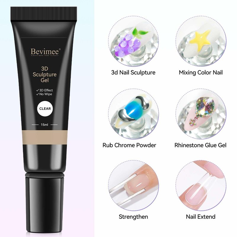 Bevimee 3D Nail Gel, Clear Sculpting Gel for Nail Art No Wipe Molding Gel For Nails, Easy To Sculpture Gel for 5D Nail Design, Nail Charm, Liner Gel, Drawing, Embossing Nail Decoration DIY Manicure