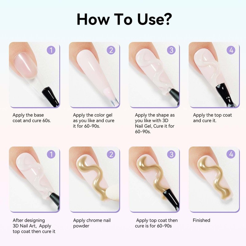 - Easy To Control: The 3d nail art gel is a soft texture but easy to carve, and the tube design makes it easy to control , ergonomic shape allows you to hold comfortably, squeeze seamlessly, and leak-free