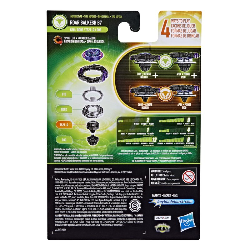 - CUSTOMIZE THE CLASH: Includes left-spin Beyblade Burst QuadDrive Roar Balkesh B7 G10 QD02 TS21-Q D03 top and launcher. Customize top to Core and Apex mode for stamina type or to Core+ and Apex+ mode for defense type