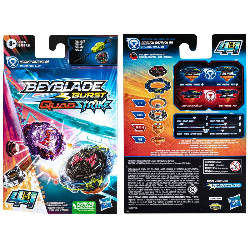 - CUSTOMIZE THE CLASH: Includes left-spin Beyblade Burst QuadStrike Ambush Bazilisk B8 G11 QD05 TB17-Q A08 top and launcher. Customize top to Core and Apex mode for balance type or to Core+ and Apex+ mode for attack type