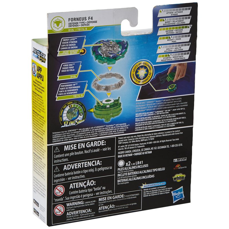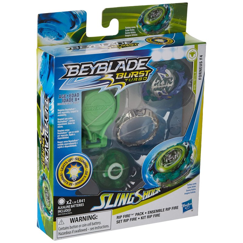 - RIP FIRE COMPETITIVE BATTLING TOP: Includes Beyblade Burst Sling shock Rip Fire Forneus F4 D12L TD11L-S right-spin top – defense type – and Sling shock right/left-spin launcher.