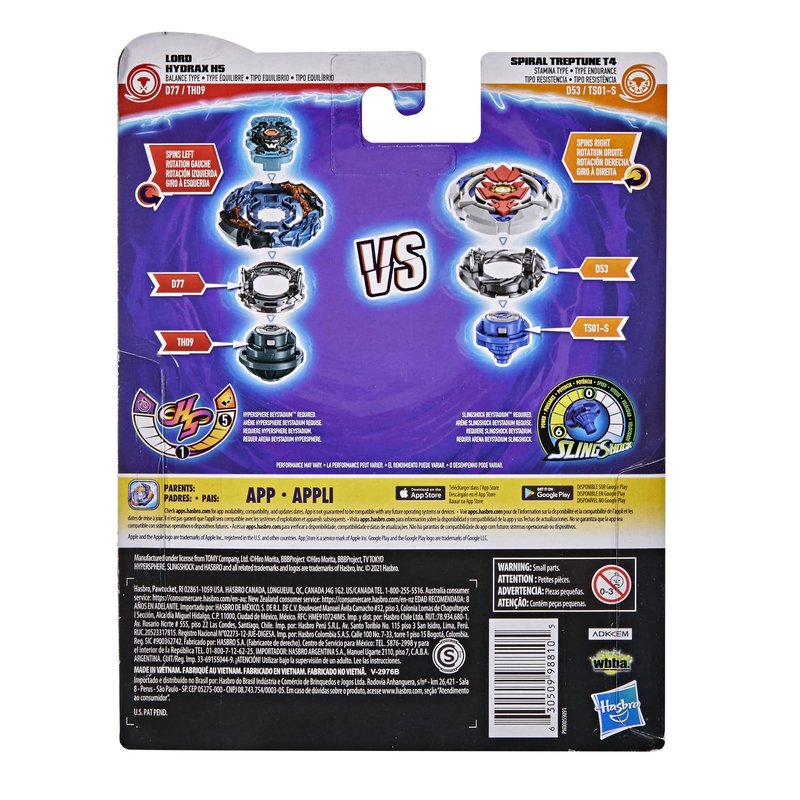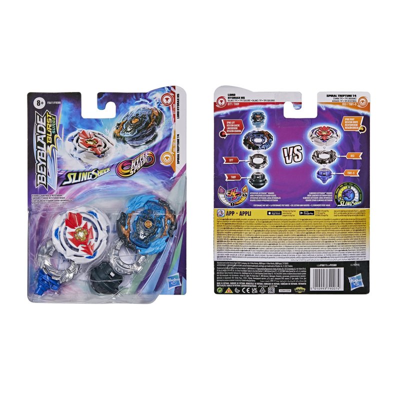 - 2 SPINNING TOPS FOR BEYBLADE BURST BATTLES: Includes Beyblade Burst Surge Hypersphere Lord Hydrax H5 D77 TH09 left-spin balance top, Slingshock Spiral Treptune T4 D53 TS01-S right-spin stamina top