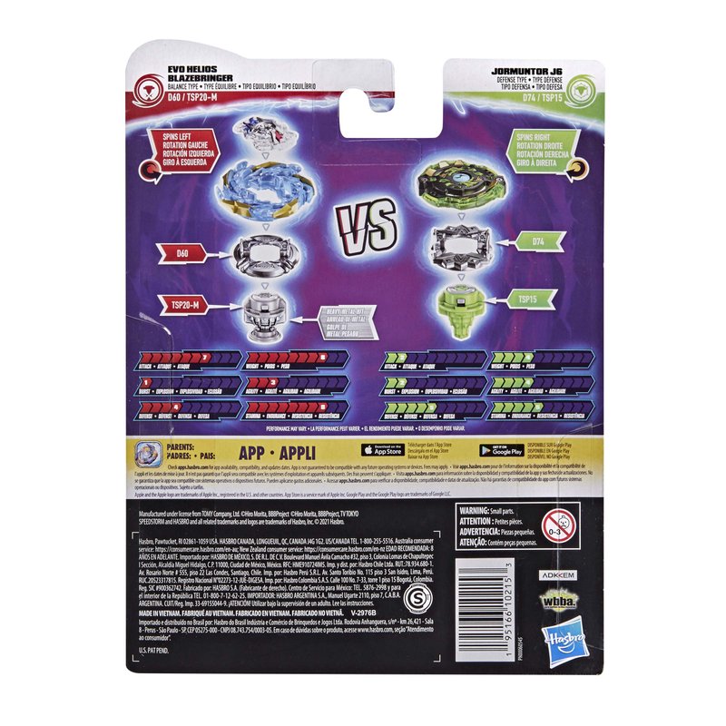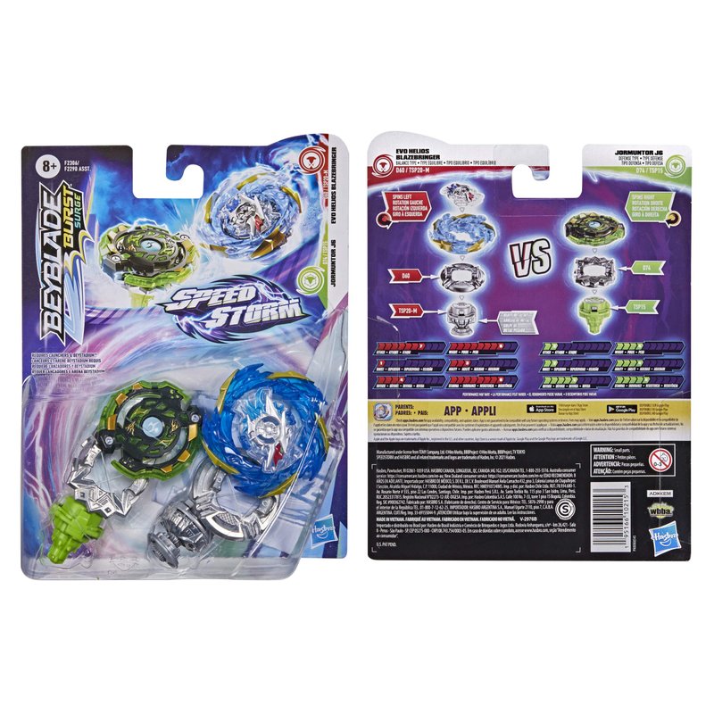 - 2 SPINNING TOPS FOR BEYBLADE BURST BATTLES: Includes Beyblade Burst Surge Speedstorm left-spin Evo Helios Blazebringer D60 TSP20-M balance top and right-spin Jormuntor J6 D74 TSP15 defense top