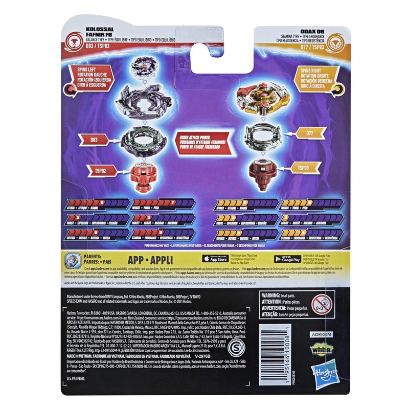 - 2 SPINNING TOPS FOR BEYBLADE BURST BATTLES: Includes left-spin Beyblade Burst Surge Speedstorm Kolossal Fafnir F6 D83 TSP02 balance top and right-spin Odax O6 D77 TSP03 stamina top