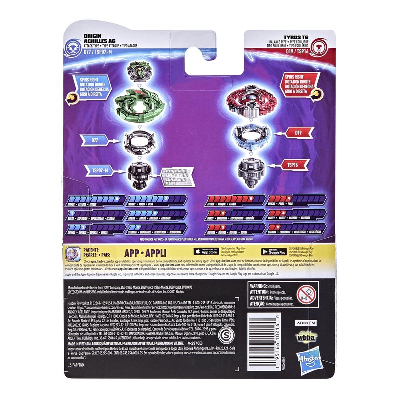 - 2 SPINNING TOPS FOR BEYBLADE BURST BATTLES: Includes Beyblade Burst Surge Speedstorm right-spin Origin Achilles A6 D77 TSP07-M attack top and right-spin Tyros T6 D19 TSP16 balance top
