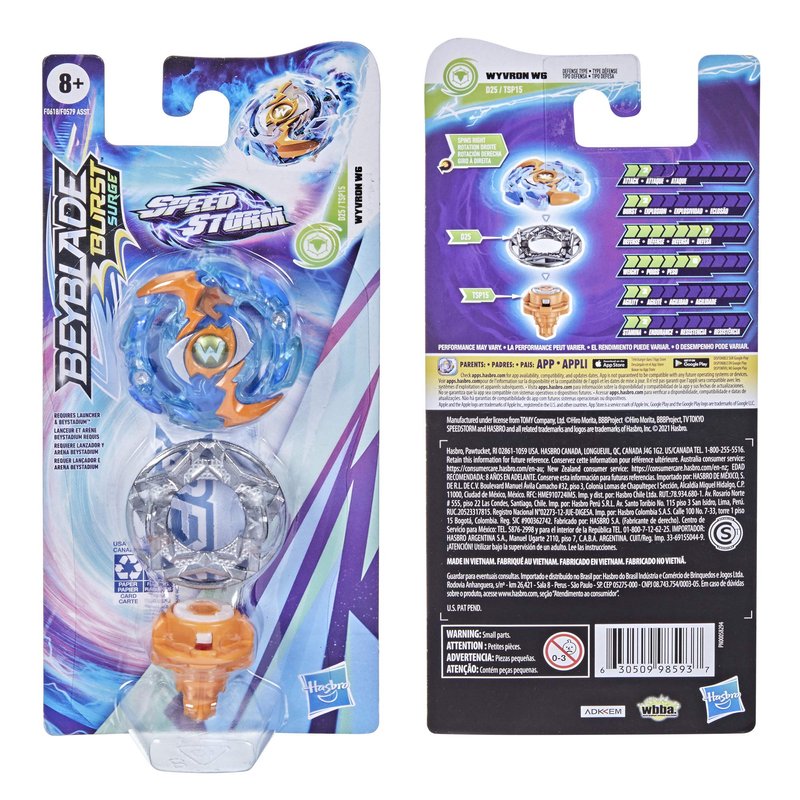 - SPINNING TOP FOR BEYBLADE BURST BATTLES: Includes right-spin Beyblade Burst Surge Speedstorm Wyvron W6 D25 TSP15 defense type top