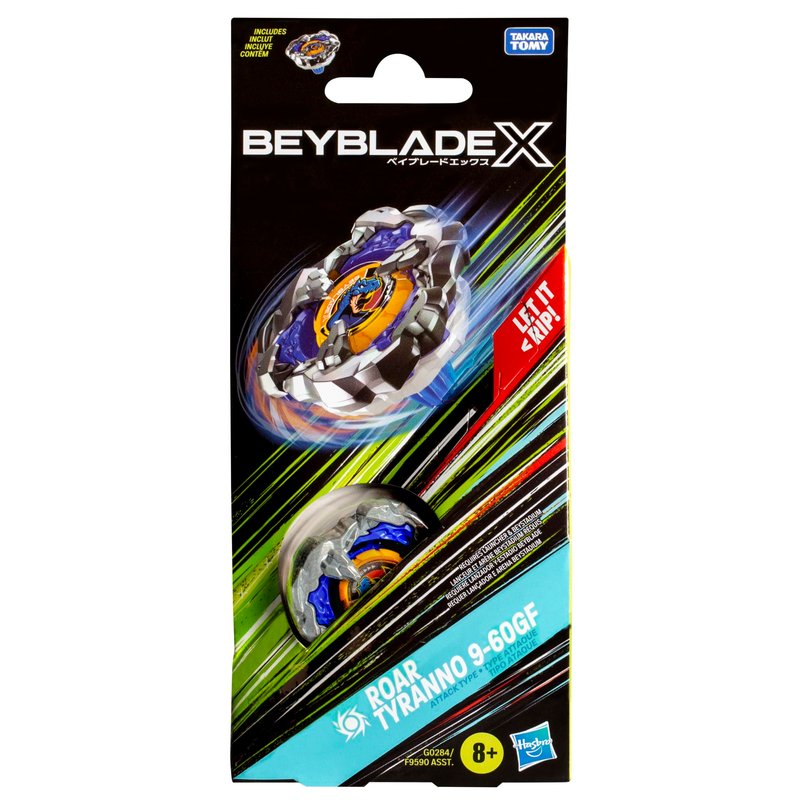 - HARNESS THE POWER: Includes Takara Tomy-designed Beyblade X top with authentic die-cast metal parts: Roar Tyranno 9-60GF Right-Spin Attack Type. The flat bit and weighted blade allow for strong attacks and heavyweight X-Dashes