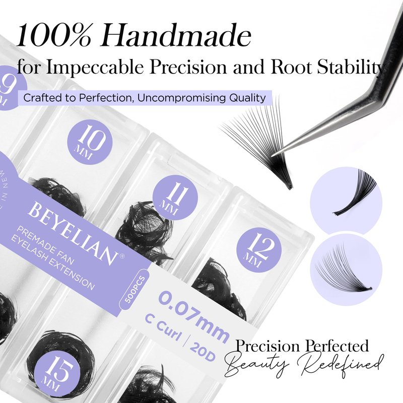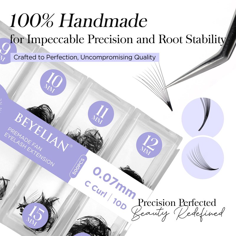 - Abundant & Economical - Unleash your creativity with Beyelian premade fans, available in packages of 500/1000 fans. Choose from C/D Curl and 10/20D options, offering several times the amount of lashes compared to standard 12-row trays. Beyelian premade fan lashes provide the most budget-friendly solution for lash artists.