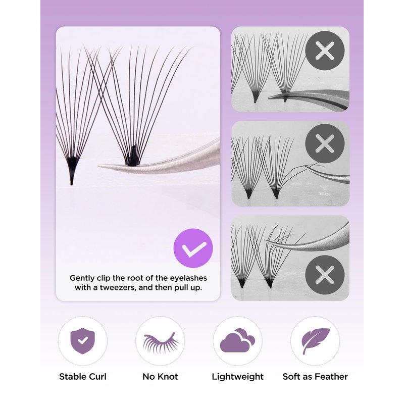- [Easy to Pick up] With the pre-bonded roots, the pre made lash fans lash extensions are easy to pick up without separation while the 2mm tape below the lashes has low adhesion, allowing for easy pickup with no glue residues