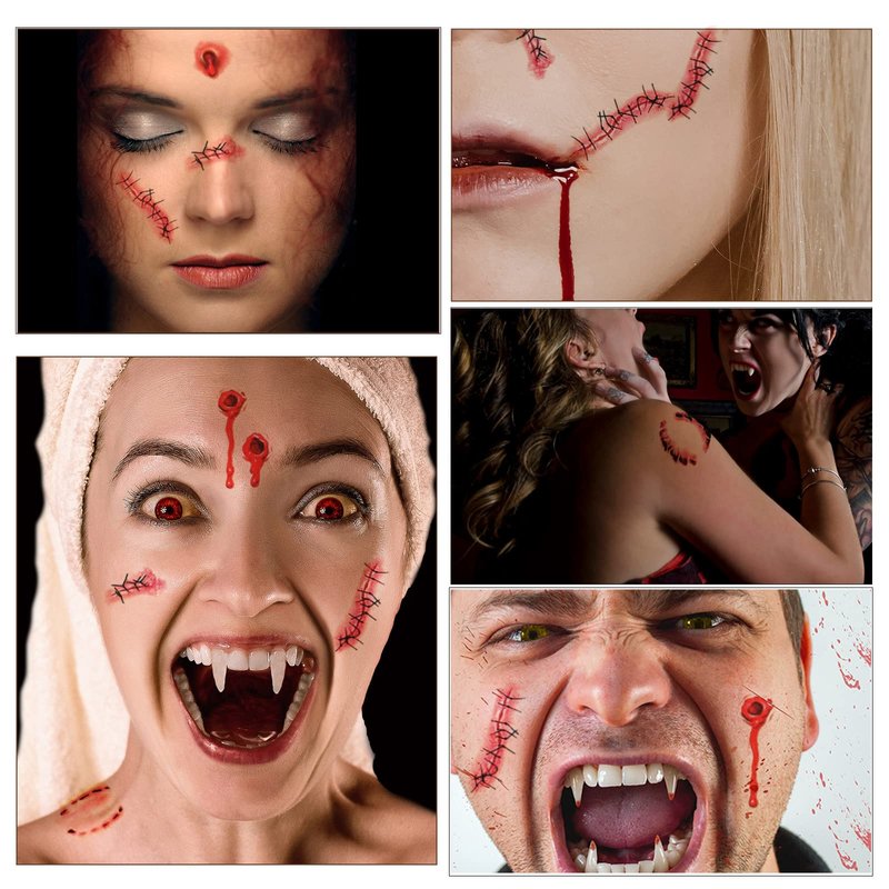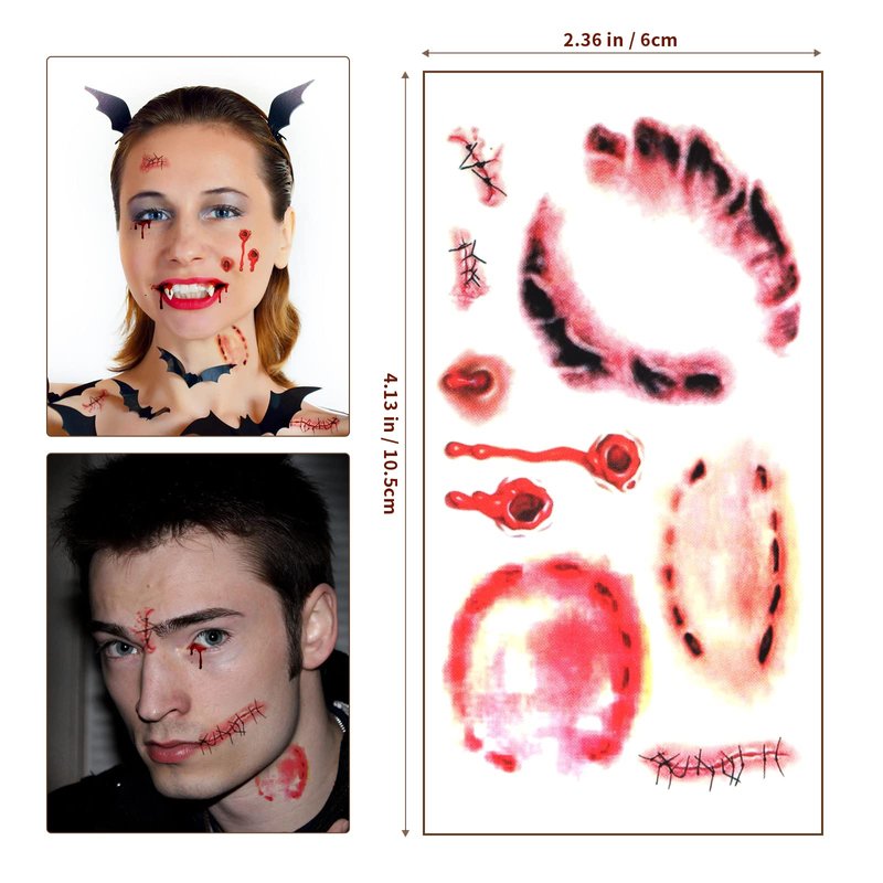 - 【WIDE APPLICATION】: Fake scars stickers are perfect for Halloween party, zombie makeup kit, vampire bite cosplay, horror masquerade party etc. Bloody tattoos can make people look like vampire and zombie