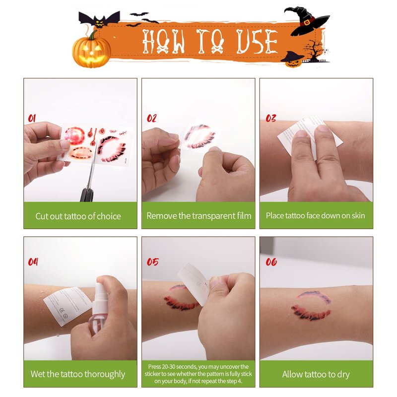 - 【EASY TO APPLY AND REMOVE】: No mess, no pain. Press fake blood tattoos down on skin, wet it thoroughly with a sponge. Wait 20-30 seconds, remove the backing paper, done! Also, easily removable by rinsing image with water, medical alcohol or other cleaner