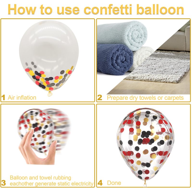 • 【Tips For Use】- These red gold black balloons latex balloons can be inflate by hydrogen, helium ( it will float more than 12 hours), and air.The best way to rub the surface of the balloons with a dry towel or hair and silk. And it is recommended to use a pump to quickly inflate so that confetti is easier to be stuck.